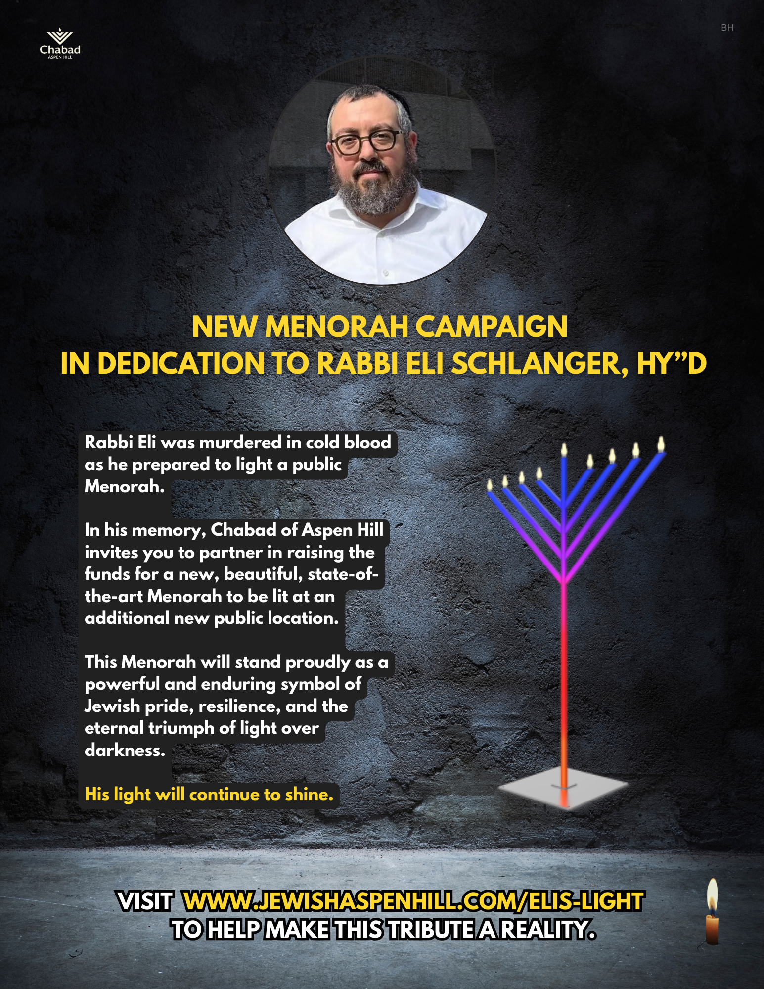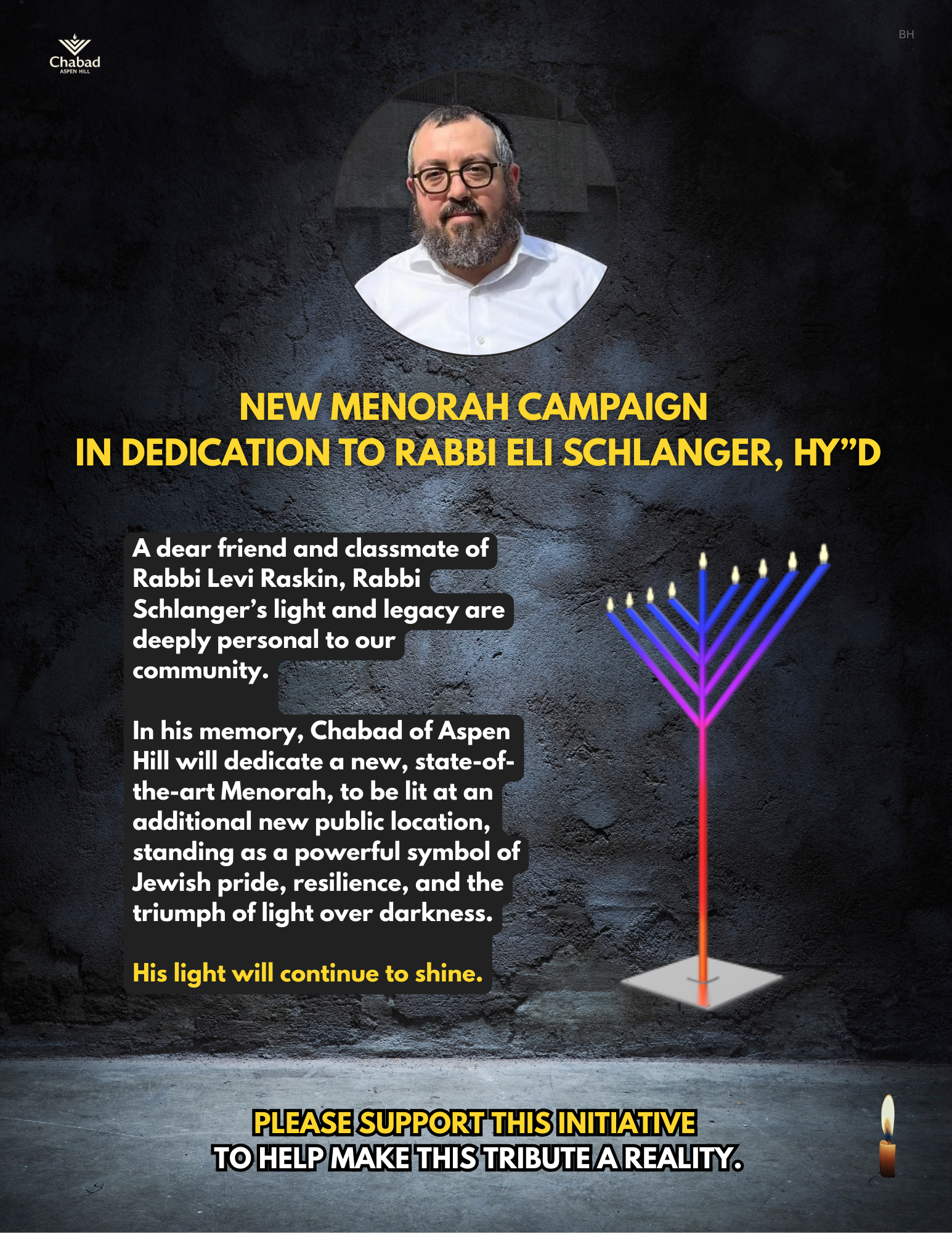 In his memory, Chabad of Aspen Hill will dedicate a new, state-of-the-art Menorah, to be lit at an additional new public location. This beautiful and enduring Menorah will stand as a powerful symbol of Jewish pride, resilience, and the eternal triumph of light over darkness.